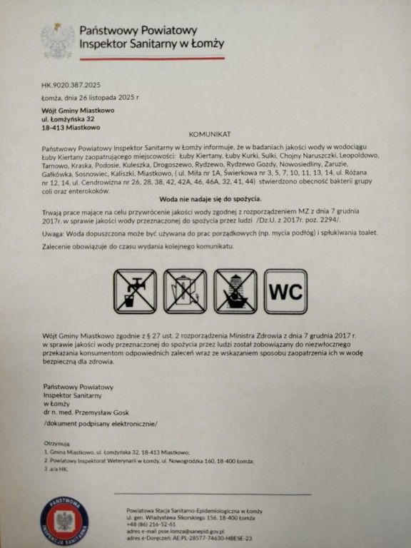 W związku z zaistniałą sytuacją woda poddawana jest dezynfekcji na całej linii wodociągowej oraz na SUW Łuby-Kiertany. W najbliższych dniach mogą wystąpić przerwy w dostawie wody, za które przepraszamy.