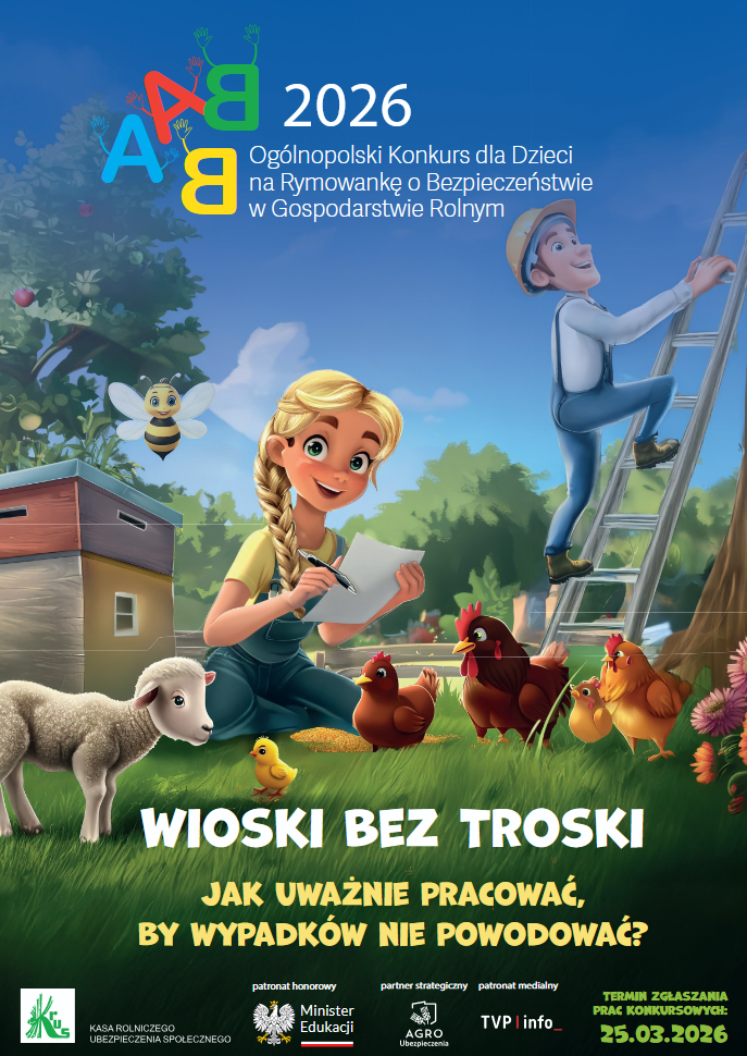 Kasa Rolniczego Ubezpieczenia Społecznego Oddział Regionalny w Białymstoku serdecznie zaprasza dzieci rolników do udziału w VII Ogólnopolskim Konkursie dla Dzieci na Rymowankę o Bezpieczeństwie w Gospodarstwie Rolnym pod hasłem „Wioski bez troski”.