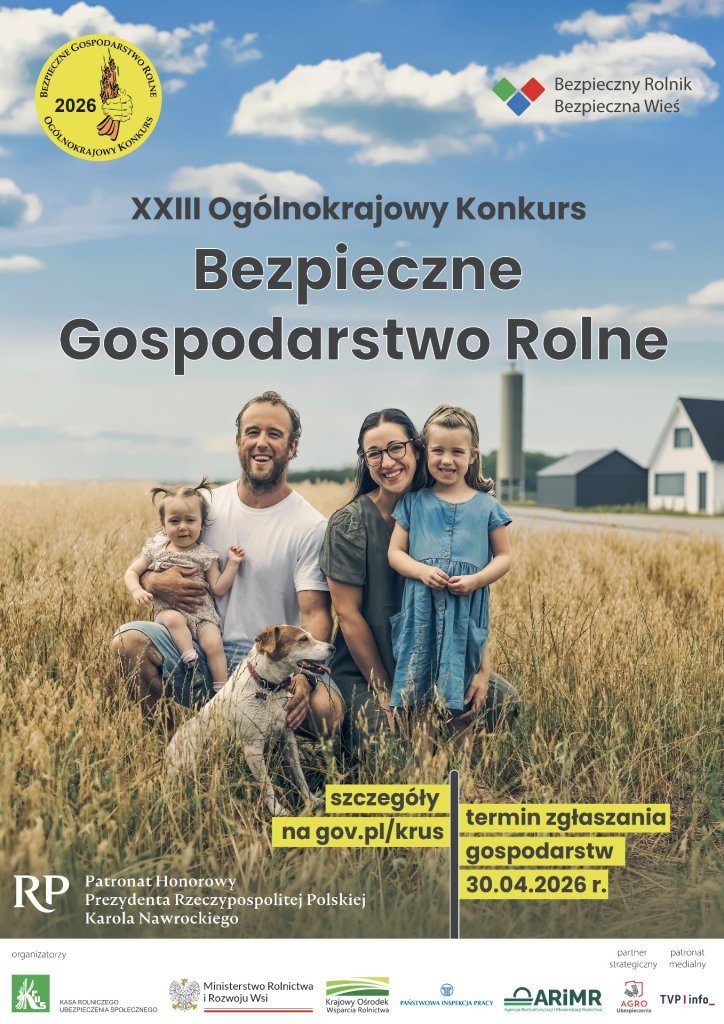 Patronat honorowy nad konkursem „Bezpieczne Gospodarstwo Rolne” objął Prezydent Rzeczypospolitej Polskiej Karol Nawrocki. Szczegóły oraz regulamin konkursu znajdziesz w Placówkach Terenowych KRUS, Oddziale Regionalnym KRUS w Białymstoku oraz na stronie internetowej www.gov.pl/krus