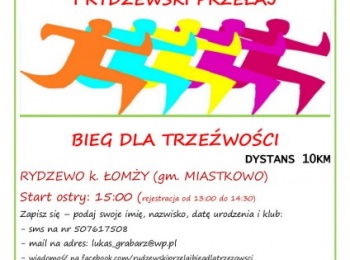 Stowarzyszenie „RAZEM” w Rydzewie oraz Wójt Gminy Miastkowo mają zaszczyt zaprosić na I PRZEŁAJ RYDZEWSKI – BIEG DLA TRZEŹWOŚCI, który odbędzie 1 maja w Rydzewie, gm. Miastkowo, powiat łomżyński. Bieg odbędzie się na dystansie 10km. Start imprezy od godziny 13:00. Start ostry biegu o godzinie 15:00....